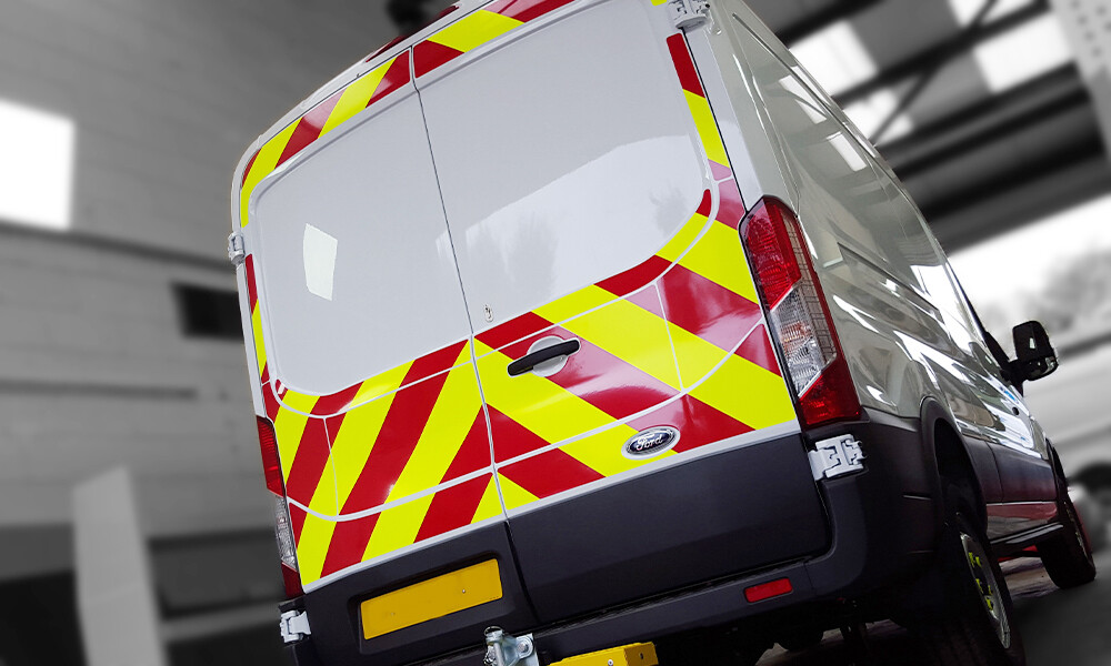 Chapter 8 Road Traffic compliant prismatic Reflective Red with yellow Chevrons. Available for Large, Medium and small vans. Ensure maximum visibility and safety with our high-performance reflective chevron kits, designed to meet industry standards for vehicle conspicuity. Ideal for emergency services, utility fleets, and roadside maintenance vehicles, these kits feature bold, angled striping in high-contrast colours that reflect light even in low-visibility conditions. Built to withstand harsh weather and road wear, our chevron kits help reduce accidents and improve compliance with safety regulations.